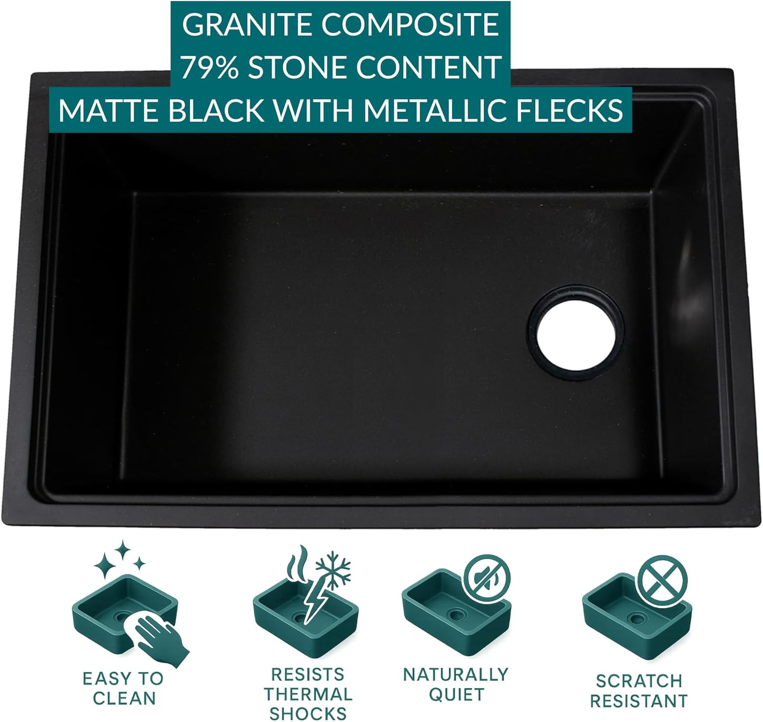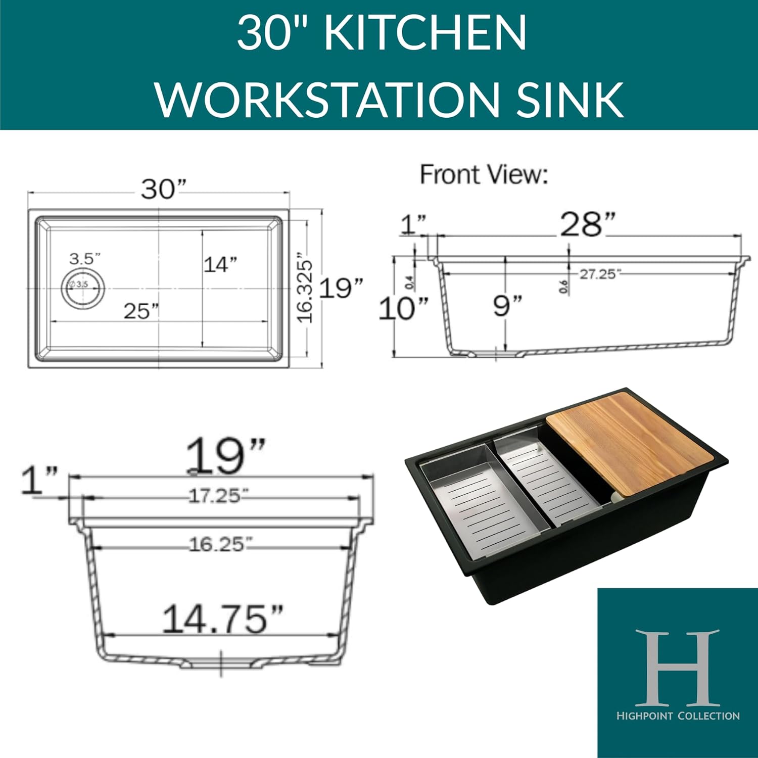 Highpoint Collection Side Drain 30" Granite Composite Workstation Kitchen Sink 30" Side Set Dualmount Granite Composite Sink made in Europe. Workstation design includes colander, rinse tray and cutting board. Versatile can be installed as topmount or undermount with drain on left or right. Basin tapers towards drain opening to help move water out of sink. High stone content 79% resists stains and scratches. Drain is not included.