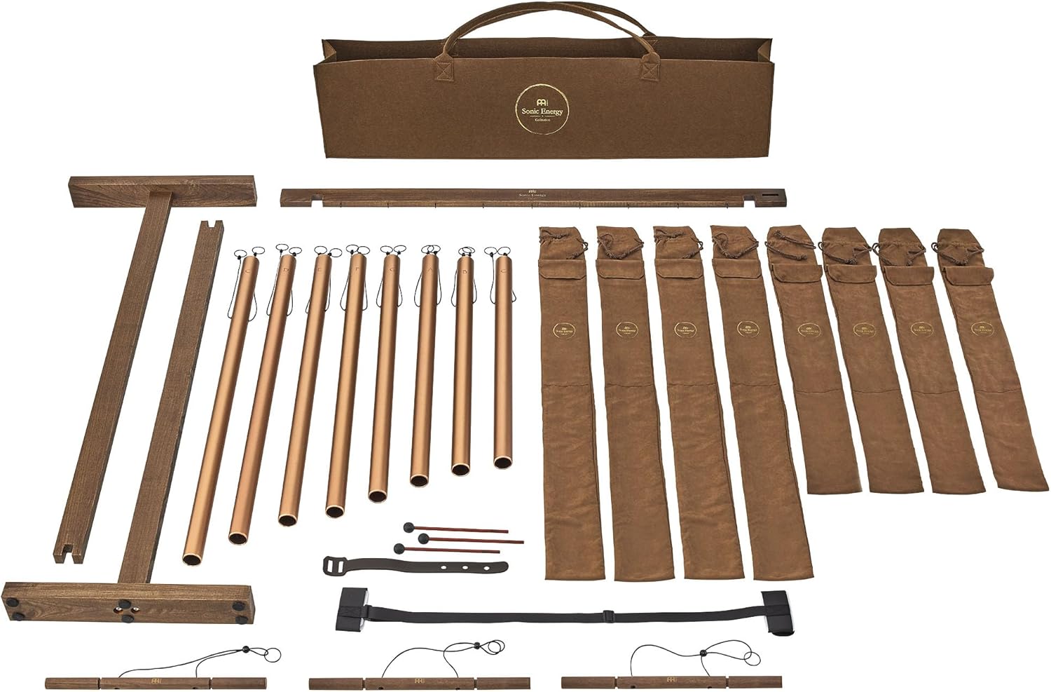 The Meinl Sonic Energy Sound Bath Tube Chimes bring soothing tones to any space. Includes 8 aluminum chimes (tuned to C4, D4, E4, F4, G4, A4, B4, C5 at 432 Hz), soft bags for each chime, 3 mallets, and 3 wooden holders for playing chimes individually. You can remove chimes from the stand to play around your listeners. The large ash wood stand assembles easily and includes a shoulder strap for transport. Chimes, mallets, and holders store neatly in the soft bag. Perfect for meditation, sound baths, and yoga—no musical training required. Dimensions: 51.6" tall x 54.7" wide. Designed in Germany. About Meinl: we’re a family-owned German brand established in 1951. A market leader in professional percussion instruments with a focus on innovation, quality, and passion for music.