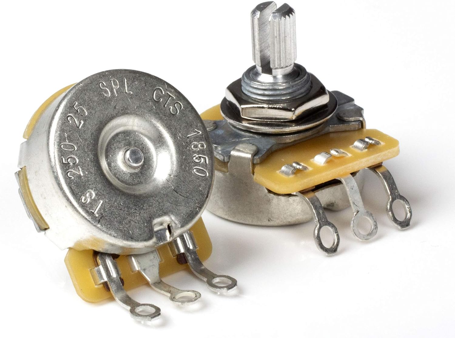 This is a 10-pack of our CT-450S2178B pots. CTS pots are the standard of the industry for good reason. Used by Gibson and Fender for many, many years, they are easily the most trusted brand in guitar pots. Ours are made specifically for us by CTS, to their tightest tolerance (10%). Appropriate hardware in included: lockwasher (use inside the guitar), flat washer & nut (use outside the guitar). The right parts to get the job done.